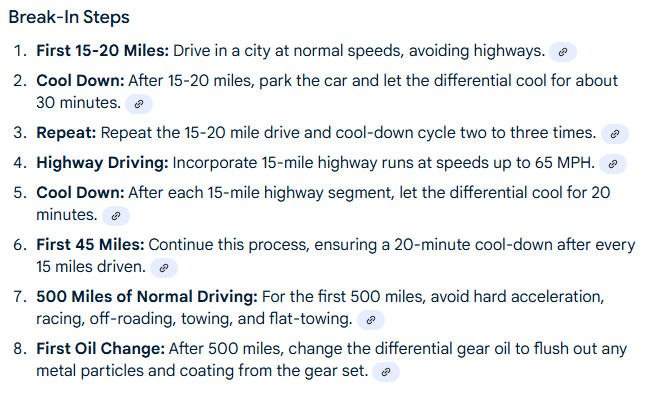 As this is written, the break in process is just about complete. We are currently on step 7…500 miles of normal driving. In my case, the bearings and gears were already broken in, but I still followed the procedure in order to work the new posi lubricant into the clutch plates and have the plates wear-in without overheating or galling. So far, the results are ‘looking’ good!