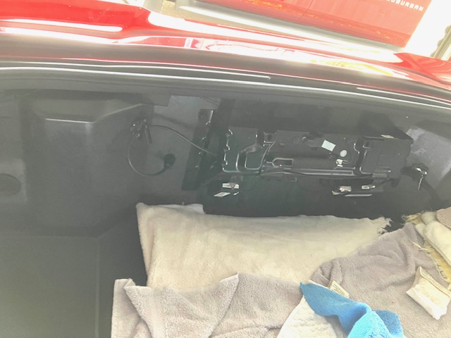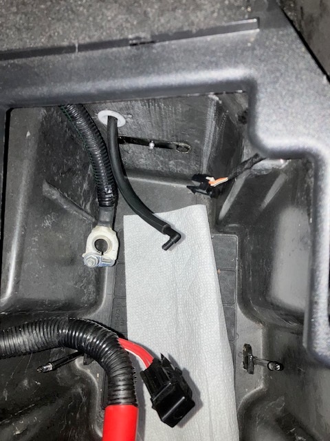 Carefully pull out the carpet over the right rear wheel well. There are no fasteners – it just tucks up under the edge of the rear hatch opening. Freeing this carpet and padding allows you to lift up the battery door frame, surrounding rear compartment floor carpet, and positive battery cable just a few inches.