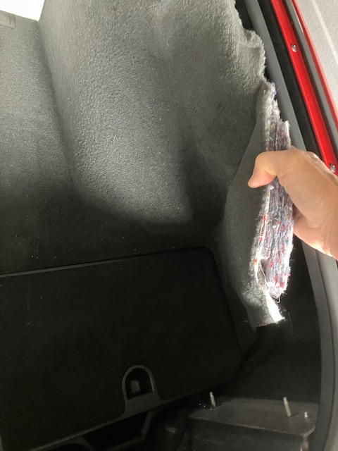 Removing the rear trim panel and partially pulling out the wheel well carpet makes battery replacement so much easier! And it’s just a few minutes’ work that saves you many more minutes, skinned hands, and if you’re like me, lots of curse words.